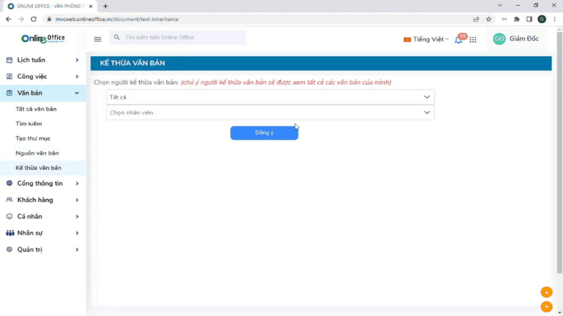 Khi có một cá nhân sắp nghỉ việc hoặc có một nhân viên mới vào làm cần kế thừa hay nhân kế thừa hàng ngàn văn bản, Onlne Office đã cũng cấp tính năng này nhằm giúp tối ưu hóa thời gian kế thừa.Sau đây là cách kế thừa văn bản: