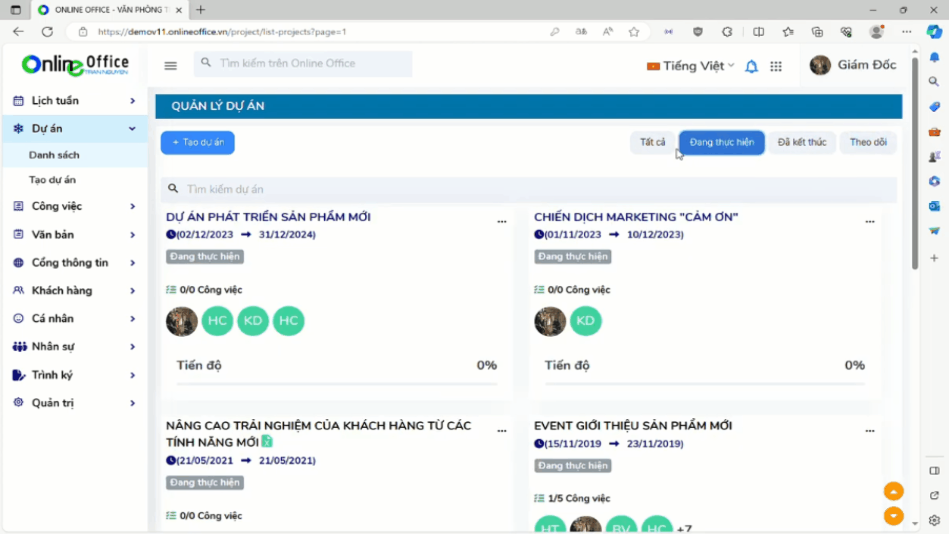 Module dự án giúp theo người quản lý theo dõi tiến độ theo thời gian thực bằng sơ đồ Gantt và Work Flow.Giúp điều phối nhằm giúp dự án hoàn thành một cách nhanh chóng và hiệu quả.Sau đây là cách để tao một dự án mới: